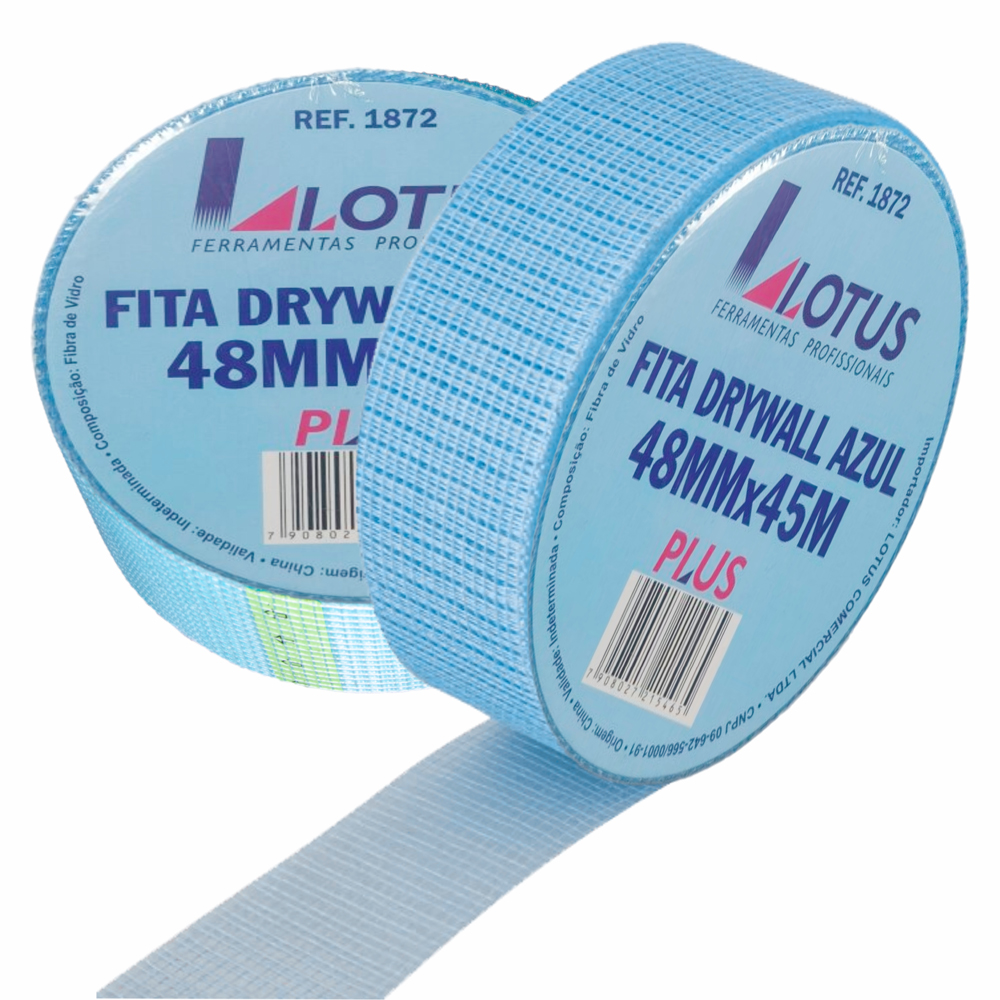 Fita telada de fios entrelaçados de fibra de vidro para drywall (para nivelamento de juntas de paredes de gesso e cartonados), com uma face autoadesiva a base d’água, alta elasticidade e resistência térmica, aplicada para manter a estabilidade do acabamento e evitar formação de bolhas, trincas ou fissuras.
